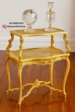 کافی تیبل دوطبقه ساخته شده از چوب راش با کیفیت و رنگ طلایی و ورق طلا کار شده است.طبقه های این کافی تیبل حصیر کار شده که میتوان آن را باتوجه به خواست مشتری تغییر داد یعنی می توان به جای حصیر از شیشه با کیفیت کار کرد که قیمت شیشه پایین تر از حصیر می باشد حصیر زیبایی خاصی به کافی تیبل می دهد حصیر کار شده حصیر بامبو می باشد مشتریان عزیز می توانند این کار را به رنگ دلخواه خود ثبت سفارش کنند.